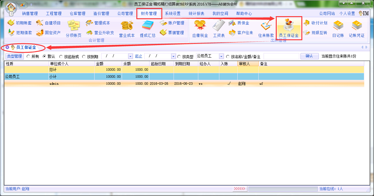 保證金收款通過審核之后,就可以看到已收和應(yīng)交保證金的差距了。(注:若有一天項目經(jīng)理A需要從保證金中扣除質(zhì)量違約金或者項目經(jīng)理A終止與公司的合作而收回保證金,均需要在下面保證金付款情況中登記,直至收支余額=0)