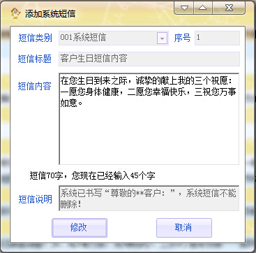 鍵“修改系統(tǒng)短信”001系統(tǒng)短信是只能修改的,無(wú)法刪除,但是在啟用ERP的第一時(shí)間應(yīng)該要修改好這3個(gè)系統(tǒng)短信的內(nèi)容。