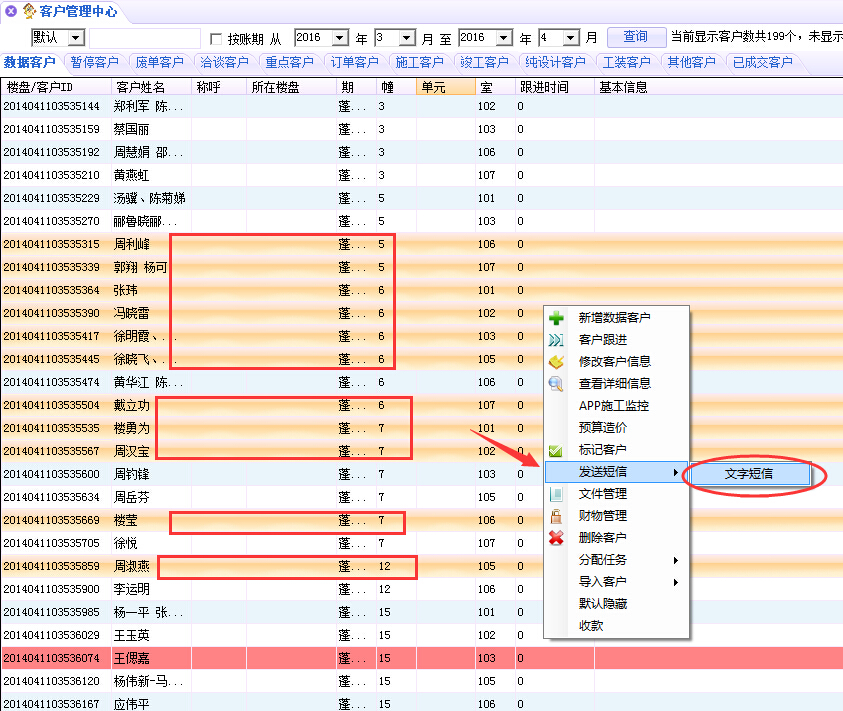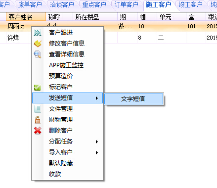 第一步:選擇客戶(或者員工列表中的員工、或者我的空間里面的公司通訊錄、或者工班管理里面的工班、或者供應(yīng)商管理里面的供應(yīng)商)右鍵發(fā)送文字短信