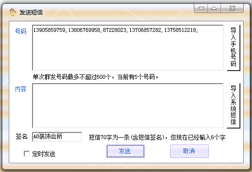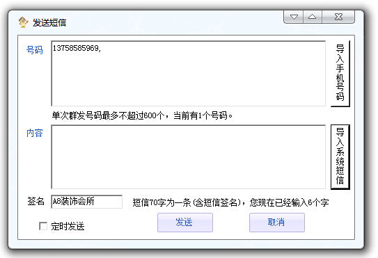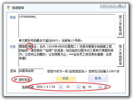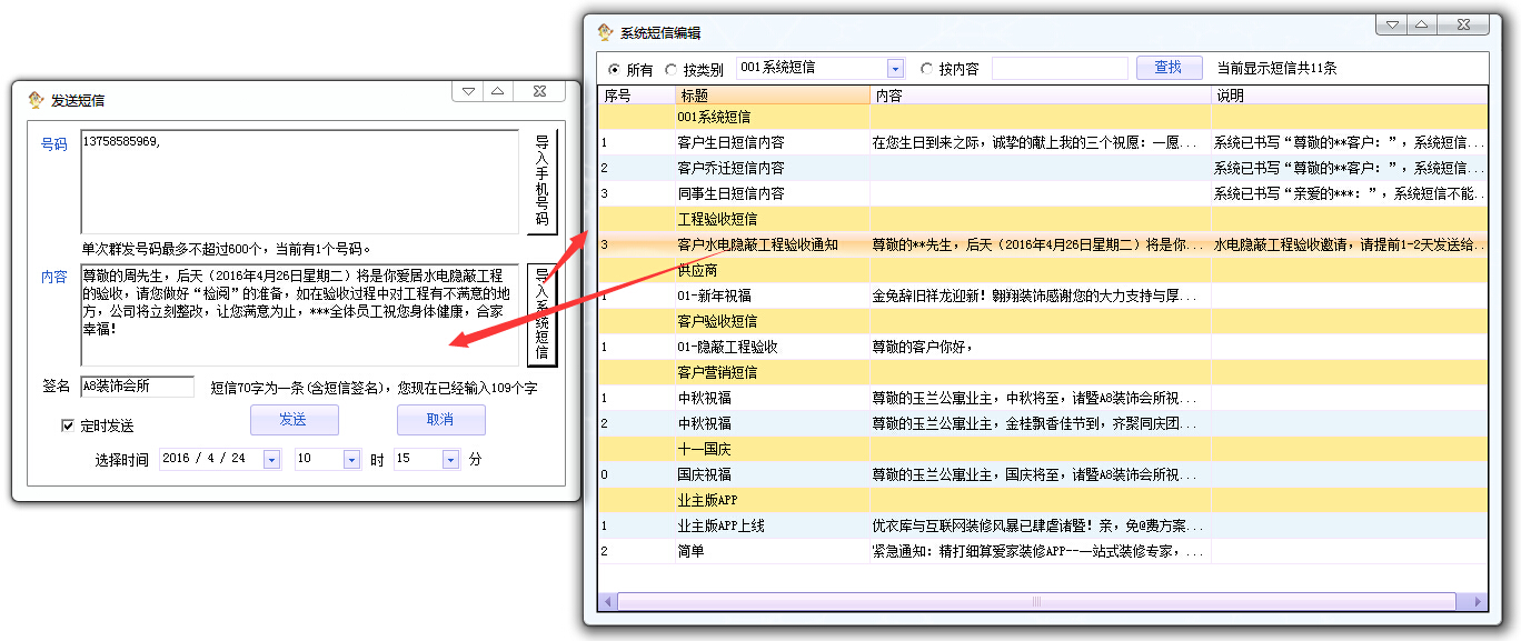 系統(tǒng)自動(dòng)將選擇的客戶或者員工或者工班或者供應(yīng)商的手機(jī)號(hào)碼取出來(lái),然后你只要輸入內(nèi)容或者導(dǎo)入系統(tǒng)短信即可發(fā)送