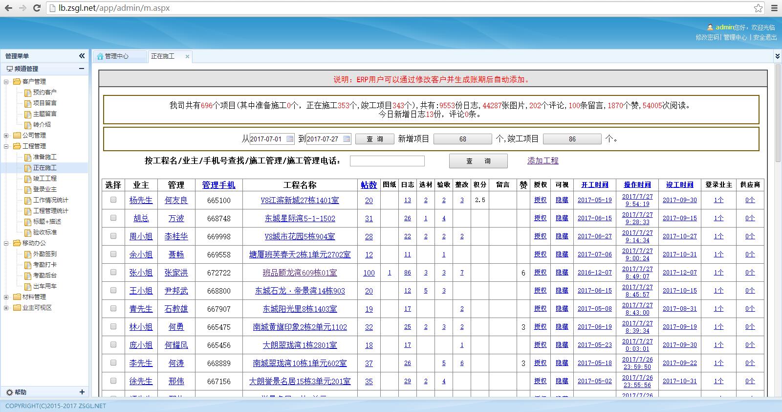 一、點(diǎn)底部施工中心,列表顯示所有工程